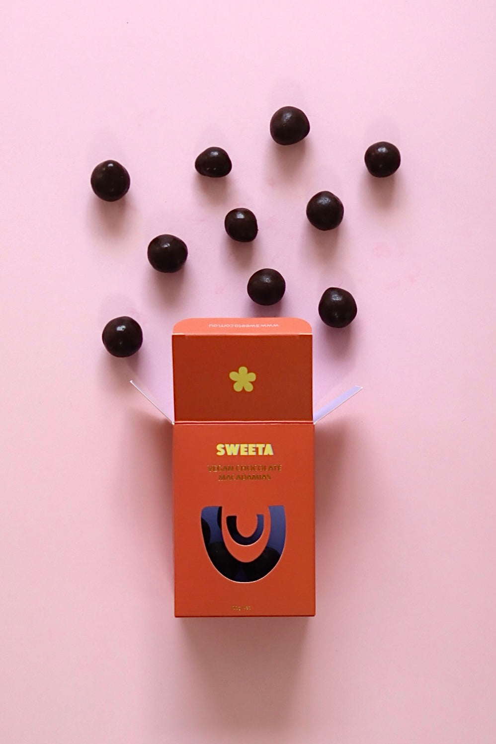 Vegan dark chocolate macadamias. Get your taste buds ready for the most luscious chocolate explosion! Our fresh and crunchy Australian grown macadamias are carefully dipped in velvety layers of delectable belgian vegan dark chocolate…do we need to say more? This decadent treat is elegant and satisfying…easy to enjoy at anytime of the day or night, wonderful for entertaining or a gift for someone special.
